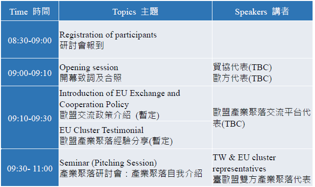 為促進臺灣與歐盟各國在產業與經濟上之合作,並協助我業者及公協會與歐盟產業聚落進行對接,外貿協會、歐盟產業聚落交流平台(ECCP)與歐洲經貿網(EEN)共同舉辦「臺歐盟商務與產業聚落研討暨媒合會」,邀請臺灣與歐盟雙邊產業聚落和中小企業參與。本活動將分為兩個部分: