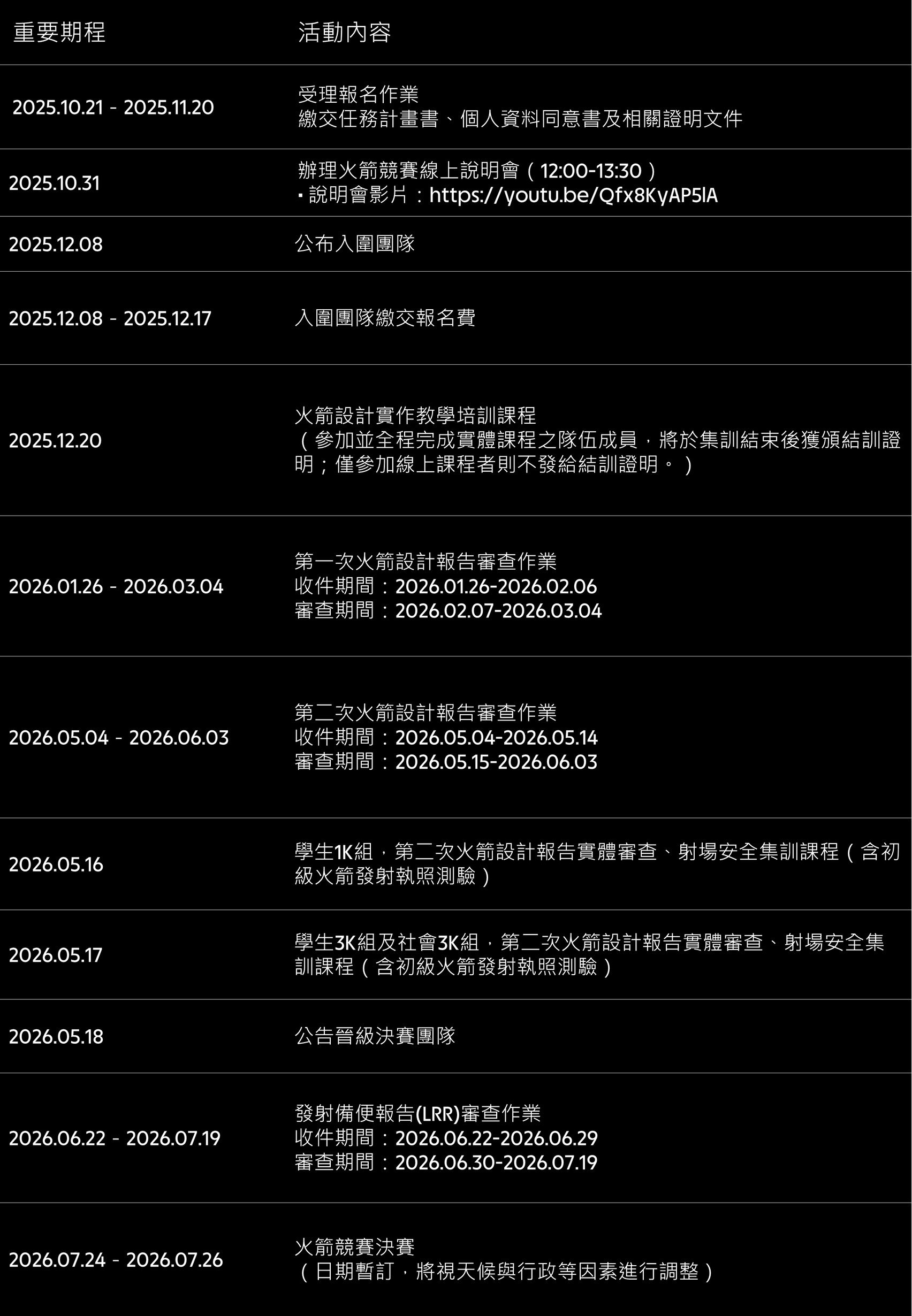 (六)公告晉級決賽團隊:錄取團隊完成二次火箭設計審查,由主辦單位依評審結果公告晉級決賽團隊,學生1K組錄取至多12組,學生3K組錄取至多6組,社會3K組至多錄取3組。晉級團隊須於決賽前完成發射前備便報告(LRR)審查。