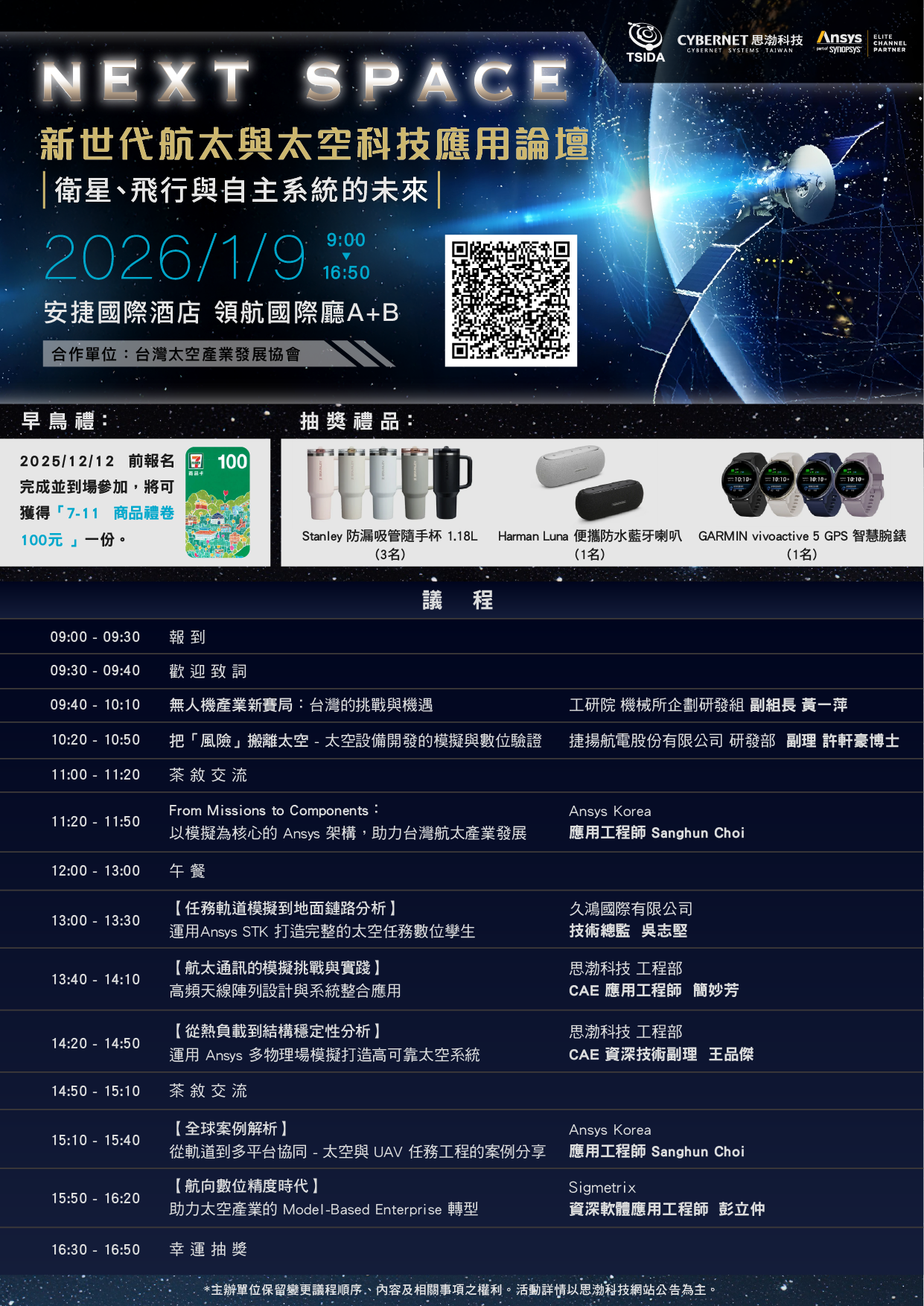 • 來自Ansys Korea的應用工程師Sanghun Choi 將介紹Ansys 公司所提供的數位模擬解決方案如何助力研發團隊於航太與太空領域中進行多物理耦合分析、熱結構模擬、電磁干擾驗證與系統級設計最佳化,協助業界縮短研發週期、提升設計可靠度與任務成功率。Choi 先生會在下午的場次分享全球的實際模擬案例,知己知彼,想了解國外業者成功的捷徑,不要錯過!