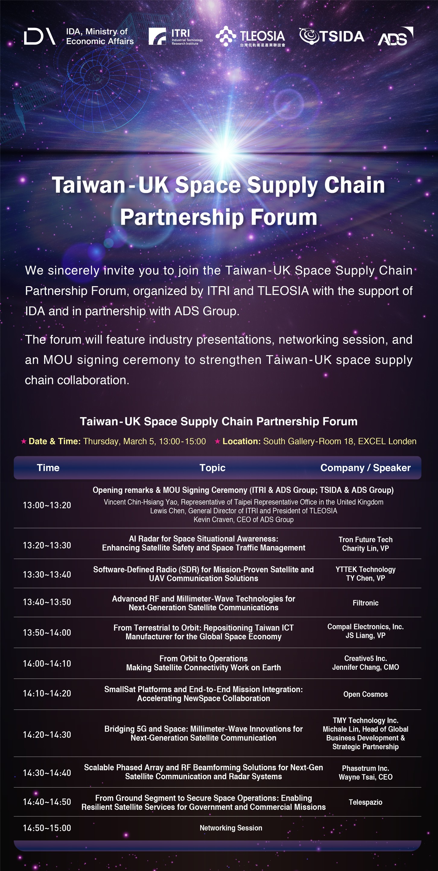 The forum will feature industry presentations, networking session, and an MOU signing ceremony to strengthen Taiwan-UK space supply chain collaboration.